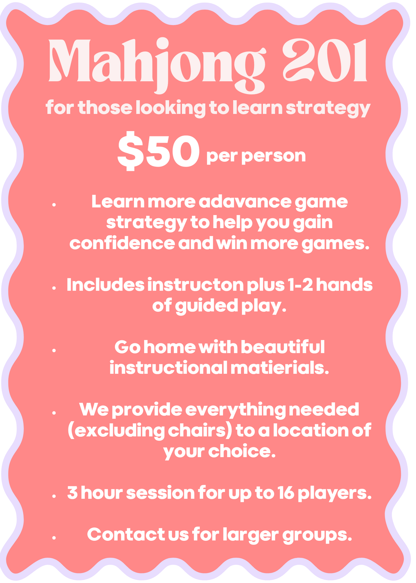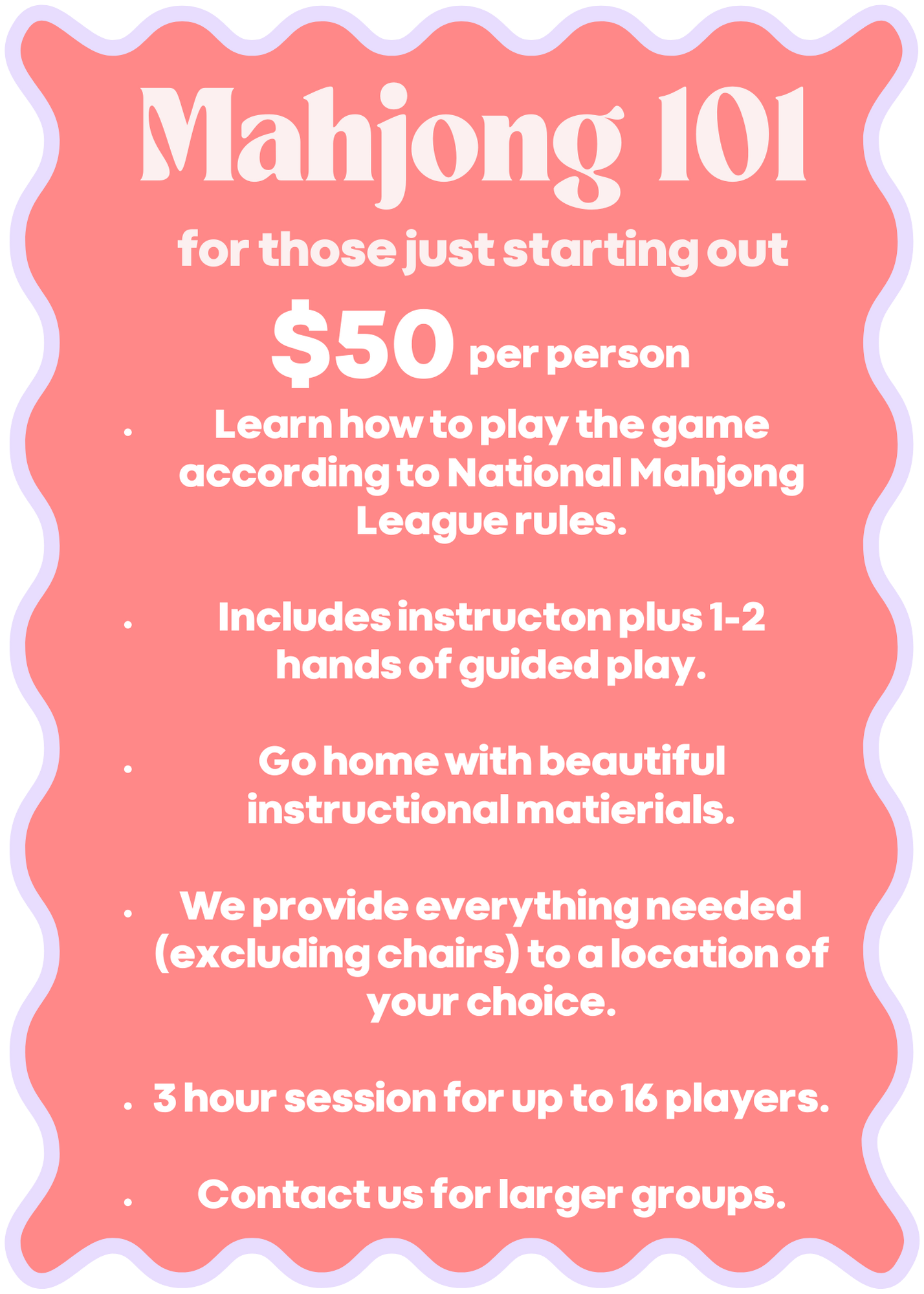 We offer classes, open play events, and private lessons, along with plenty of mahjong content on our Instagram to keep you inspired and learning.